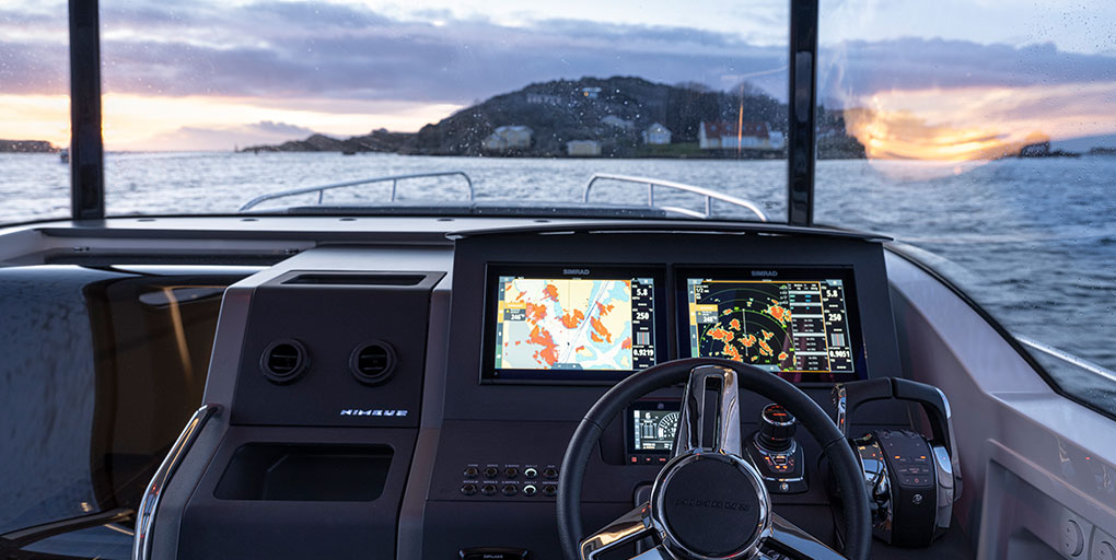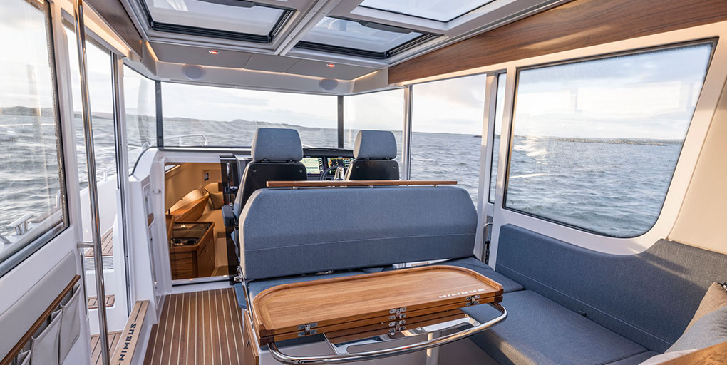 Die großzügige Deckenhöhe und das natürliche Licht im Salon, kombiniert mit den vollständig zu öffnenden Seitentüren, der offenen Achtertür und den geöffneten Dachklappen kreieren ein Gefühl eines Daycruisers. Die Steuerkanzel bietet zwei Personen Sitzmöglichkeiten und hat reichlich Stauräume. Als Fahrer bietet sie die Option, bei der Fahrt zu stehen oder zu sitzen. Das Armaturenbrett bietet Platz für zwei 12-Zoll Plotter. Optional gibt es professionelle Stoßdämpfung der Sitze oder Joystick-Lenkung.