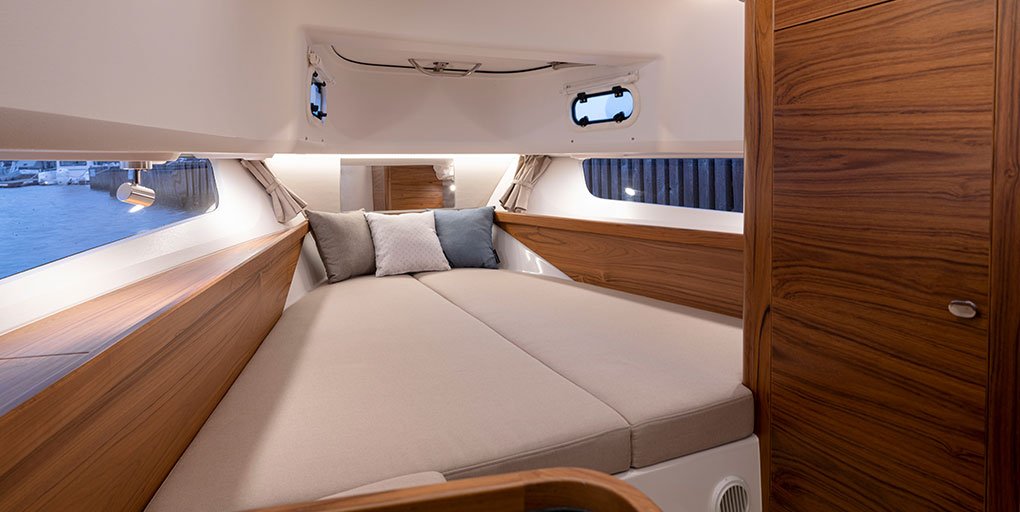 Das große Achterdeck kann als Ladefläche benutzt werden und hat eine faltbare Bank mit Fenderhalter. Zusätzlich bietet das Achterdeck einfach zugängliche Stauräume, die bis zu 2500L fassen und ideal für das Verstauen von Ausrüstung, Werkzeugen und Gepäck sind. Die Badeplattform und das Achterdeck sind großzügig gestaltet und bietet mehreren Personen gleichzeitig Platz. Optional verfügbar ist ein zweiter Steuerstand mit Plotter und Joystick an Steuerbord auf dem Achterdeck. Das Vordeck bietet Raum für ein Sofa und ein Sonnenbett, sowie eine große Ladeluke mit Zugang zu der vorderen Kabine. Dank der hohen Bordwände kann das Vordeck als Sitzmöglichkeit genutzt werden. Unter Deck befindet sich eine vollausgestattete Kombüse, zwei separate Kabinen mit Platz für zwei Paare oder eine vierköpfige Familie, sowie eine geräumige Nasszelle mit Toilette und Dusche mit ausreichender Kopffreiheit.