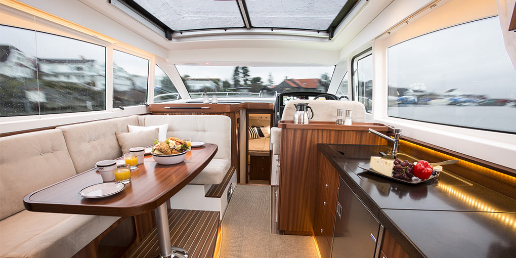 Die verklebten Scheiben des Aufbaus bieten neben modernem Design, eine ungewöhnlich gute Stabilität und Geräuschminderung. Das Armaturenbrett am Steuerstand hat Platz für zwei 12 Inch Plotter nebeneinander. Badeplattform, Cockpit und Salonboden befinden sich auf gleicher Ebene. Der Salon ist hell, luftig, geräumig und modern, während Textilien und Polster für Gemütlichkeit sorgen. Die Holzarbeiten im Salon und Cockpit zeugen von hoher Handwerkskunst und Qualität und tragen zur angenehmen Atmosphäre bei.